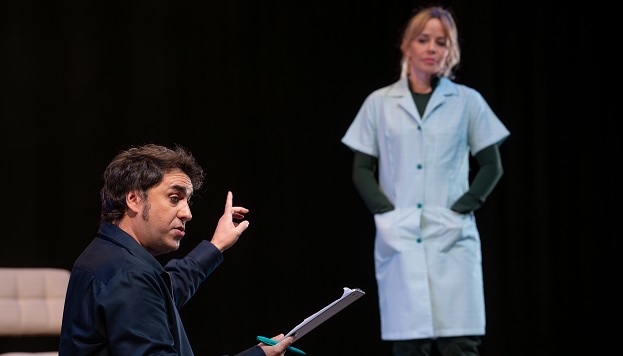 María Adánez encarna con soltura un personaje que camina por la cuerda floja de la verosimilitud, la que va de la realidad a la fábula y por la que tantas veces se caen los intérpretes y directores. Y José Troncoso, en el papel del neurólogo que la trata, la acompaña en esta comedia desternillante e irónica, salpicada de reflexiones inteligentes sobre lenguaje: cárcel y expresión de nuestra identidad al mismo tiempo. El logro más difícil de Ernesto Caballero es hacer teatro a partir de un tema tan abstracto como el de la corrección lingüística, que en un primer momento puede parecer muy árido. Pero del idioma, de sus límites, orígenes y posibilidades, nunca hemos dejado de hablar. Antes citábamos a Nebrija, pero también podríamos referirnos al Diálogo de la lengua de Juan Valdés y a las innumerables obras de ficción que abordan un tema central de la literatura. La gramática es simultáneamente un homenaje a los grandes autores de nuestras letras y al acervo popular del habla. Casi podría entenderse como una poética de Ernesto Caballero, como una reflexión sobre su propia labor de escritor y dramaturgo. Nuestras faltas y carencias se suplen con otro tipo de recursos expresivos, que tiran del ingenio, la entonación y el ritmo cuando nos expresamos por nosotros mismos. La norma es solo un modelo, que despojada del error se aleja de la naturalidad. La obra tiene momentos cargados de belleza, como cuando María Adánez recuerda algunas citas inolvidables. Me quedo con la de Ramón Gómez de la Serna: «La adolescencia es cosa bárbara, es comerse con la mirada los langostinos crudos que se ven en las pescaderías, querer cazar osos blancos en los escaparates de las peleterías, pedir un periódico que no se vende nada y que no tienen en el puesto de diarios, temer convertirse en regadera y creer que una mujer hermosa pura y vacante nos va a detener en la calle para decirnos que nos adora».